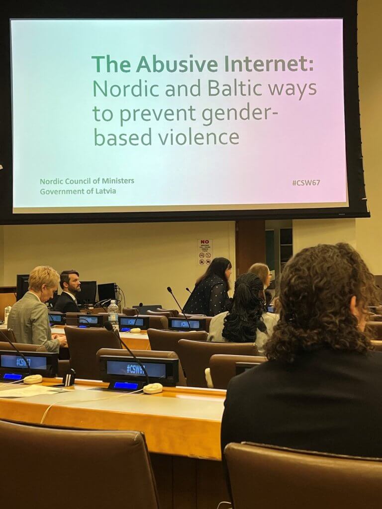 Norræna ráðherranefndin í samstarfi við lettnesk stjórnvöld stóðu fyrir afar áhugaverðum viðburði í tengslum við Kvennanefndarfund Sameinuðu þjóðanna, CSW67. Viðburðurinn bar yfirskriftina: „The abusive internet: Nordic and Baltic ways to prevent gender based violence“ og fjallaði um þær aðgerðir sem norðurlöndin og baltnesku ríkin hafa ráðist í til að taka á stafrænu kynbundnu ofbeldi.