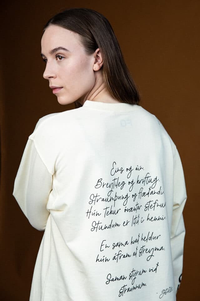 FO bolurinn er rjómalitaður í oversized sniði úr mjúkri bómull. Framan á er ljósmynd eftir Önnu Maggý sem sýnir FO á táknmáli, túlkað af Aldísi A. Hamilton. Aftan á er frumsamið ljóð eftir GDRN um baráttuna gegn kynbundnu ofbeldi.
